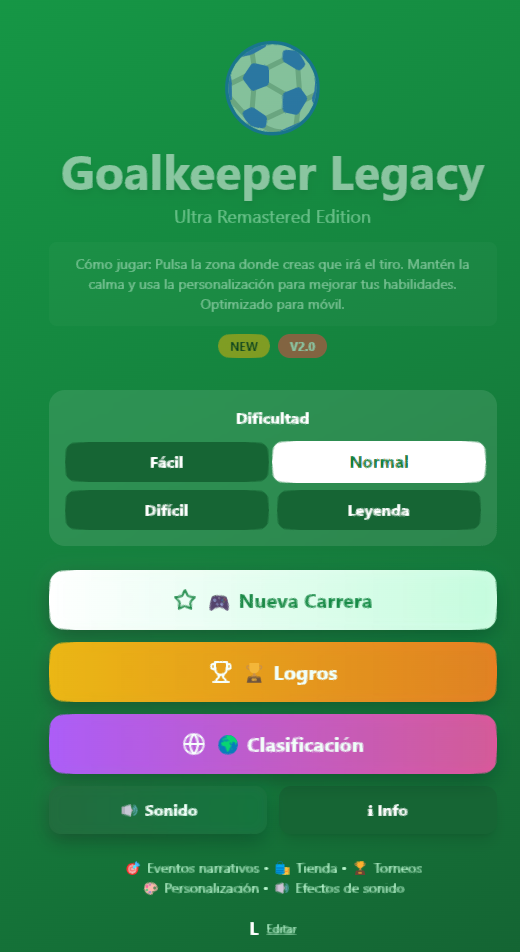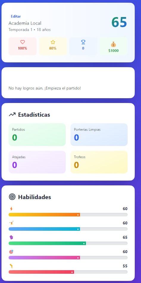 - 📈 Progresión de habilidades: entrena, mejora y evoluciona como portero.